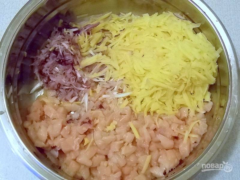 Натрите лук и картофель на крупной терке. Положите к мясу, посолите и перемешайте. Дайте постоять 10 минут.