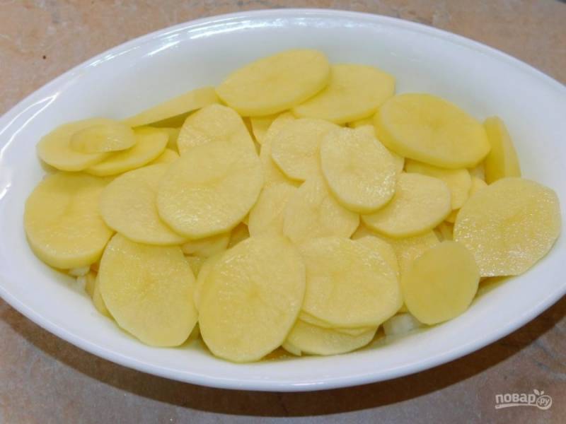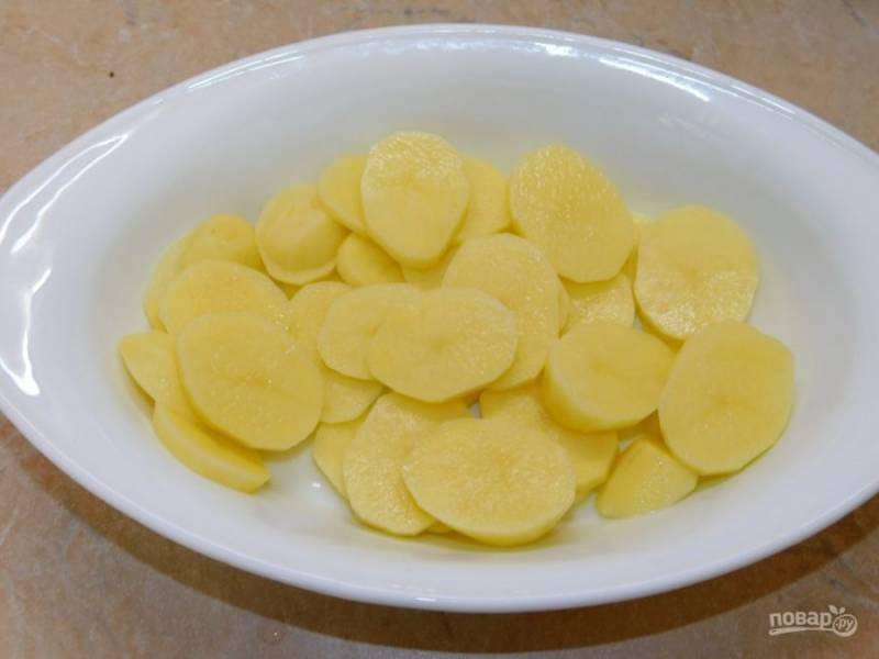 В чашу для запекания, смазанную маслом, выложите половину нарезанного картофеля.