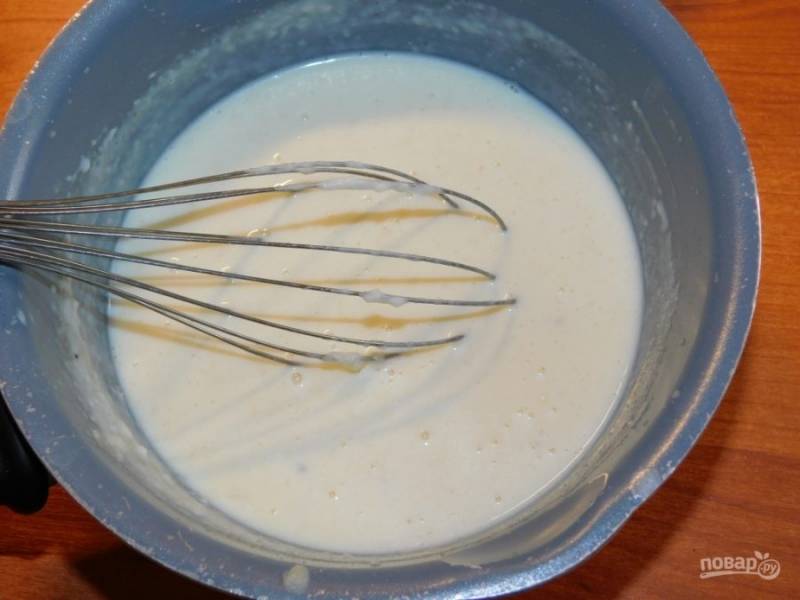 Отдельно смешайте сливки с мукой. Добавьте соль, специи и чеснок.