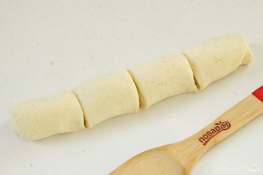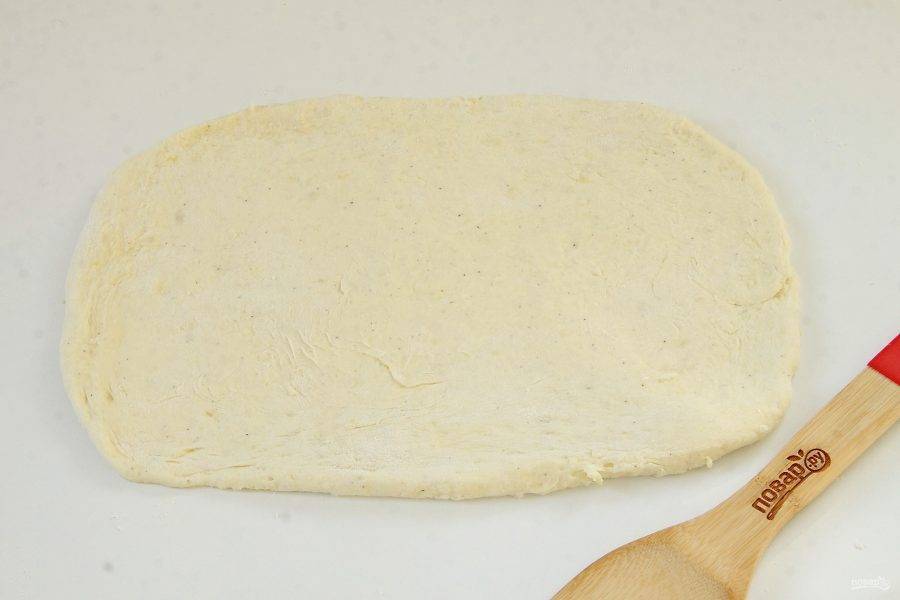Раскатайте тесто в пласт, толщиной около 5 мм, припылив стол мукой.