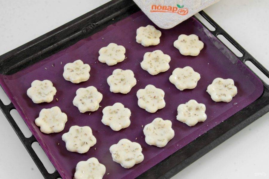 Выложите печенье на противень, застеленный пергаментом или силиконовым ковриком. Смажьте растительным маслом и посыпьте розмарином.