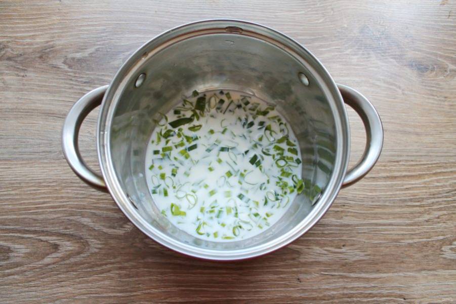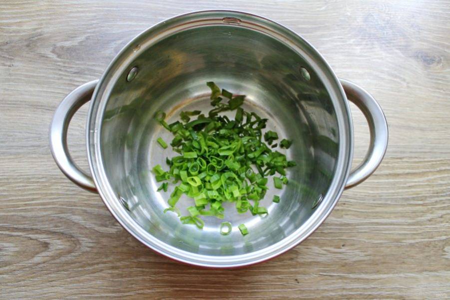 Зеленый лук вымойте и обсушите. Мелко его порежьте и выложите в кастрюлю с толстым дном.