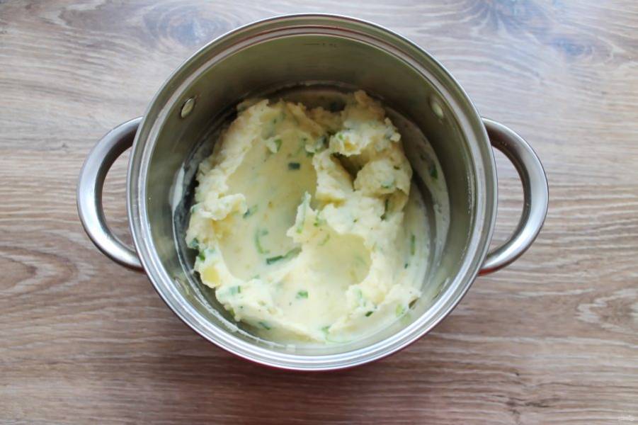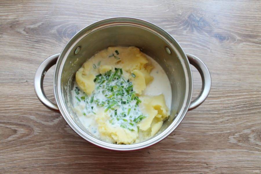 Влейте в картофельное пюре молоко с зеленым луком, посолите и поперчите.