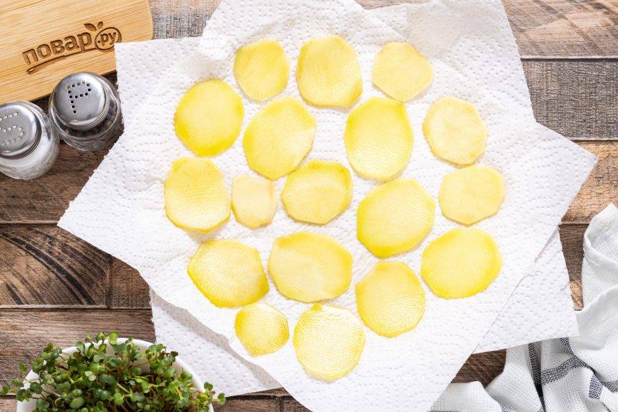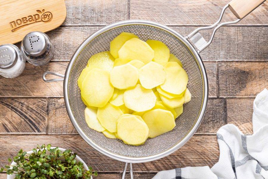 Переложите картофельные слайсы в глубокую миску. Залейте кипятком, оставьте на 3-5 минут.