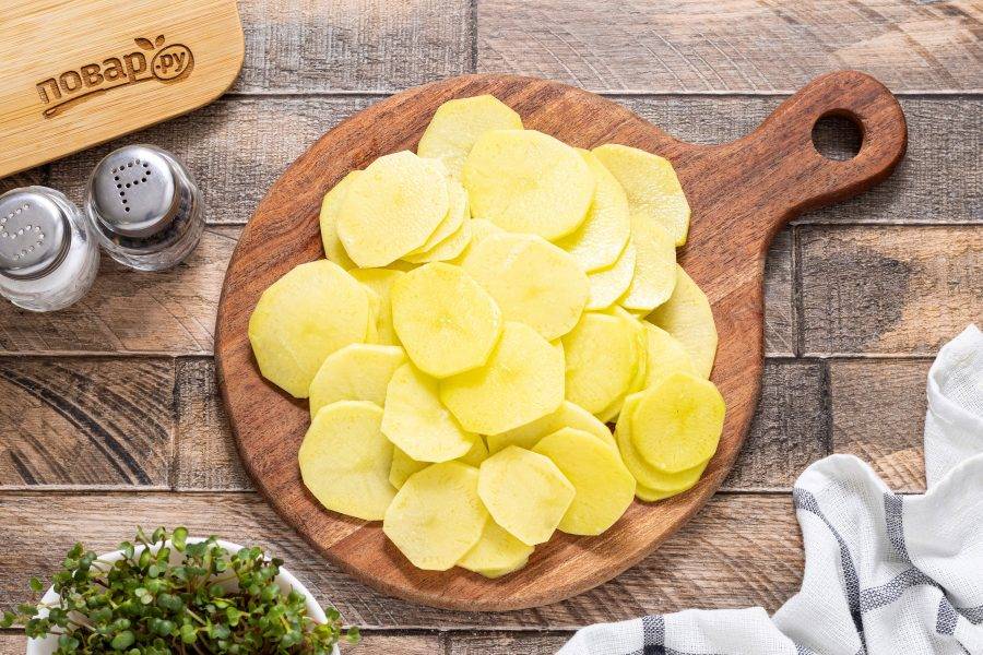 Нарежьте на тонкие слайсы с помощью овощечистки или специальной терки-мандолины.
