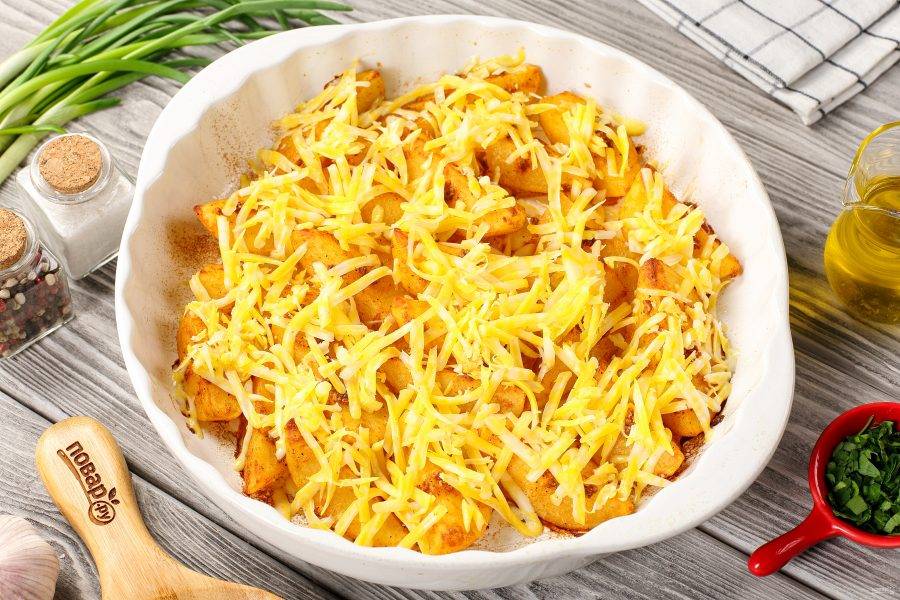 За 5-10 минут достаньте картошку и посыпьте тёртым сыром.