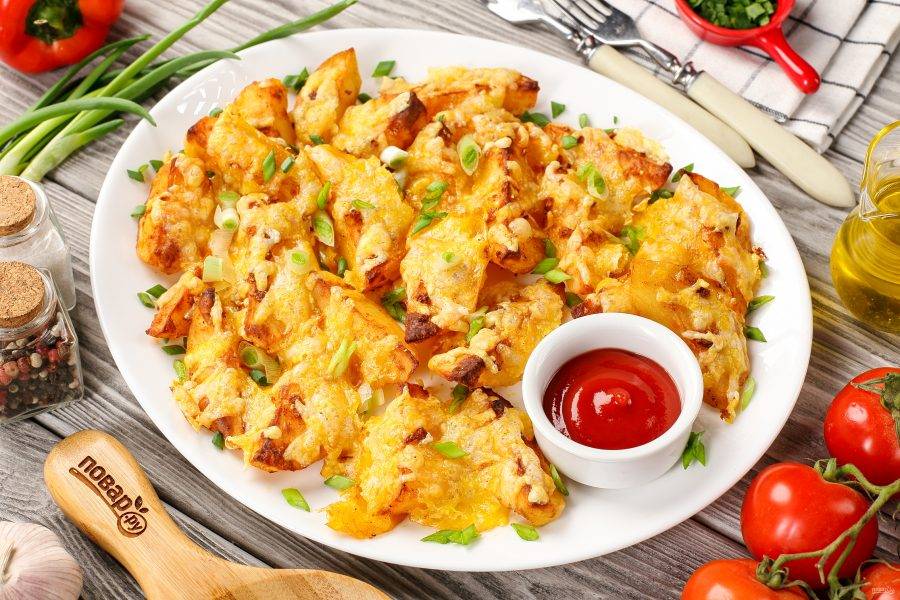 Картофельные дольки с сыром в духовке готовы. Подавайте в горячем виде.