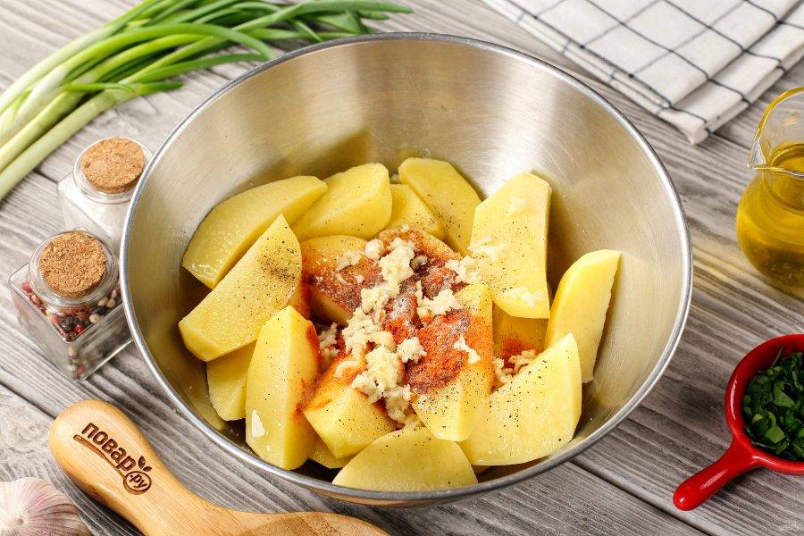 Добавьте к картофелю давленый чеснок, растительное масло, соль и специи по вкусу.