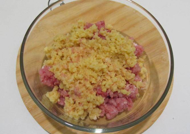 Картофель чистим и также измельчаем при помощи мясорубки, добавляем его к фаршу.