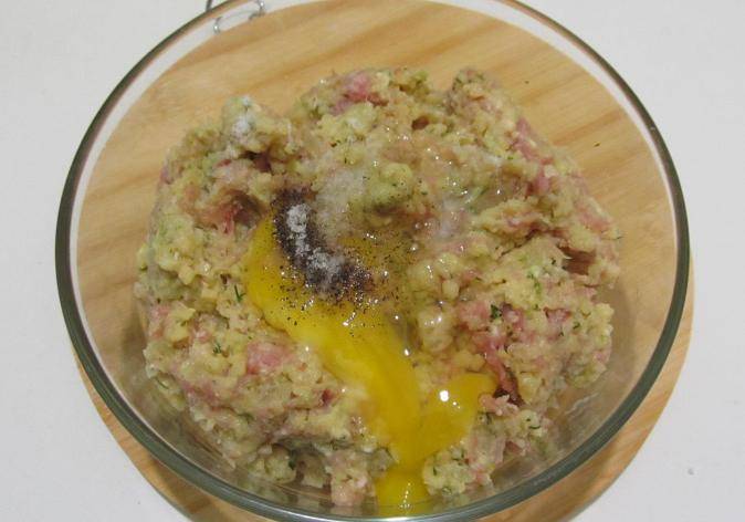 Разбиваем в миску с фаршем яйцо, добавляем соль и молотый перец, еще раз тщательно вымешиваем фарш.