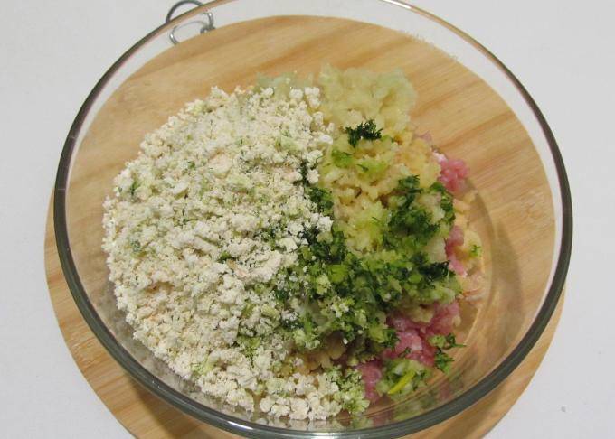 Все остальные ингредиенты: репчатый лук, чеснок, укроп и хлеб - тоже необходимо пропустить через мясорубку и выложить в миску с фаршем и картофелем, тщательно перемешиваем все.