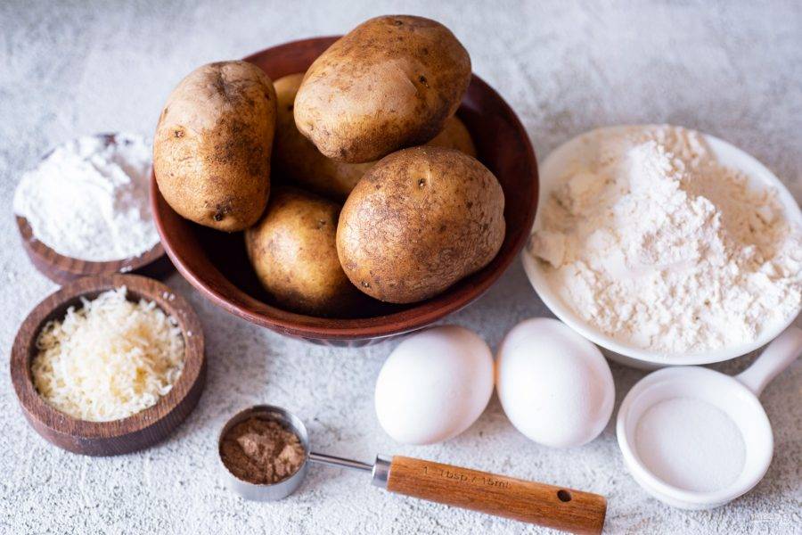 Добавьте к картофельной массе крахмал, мускатный орех, пармезан.