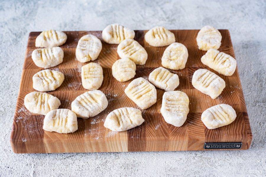 Рабочую поверхность припылите мукой, выложите картофельное тесто, которое для удобства поделите на 4-5 частей. Из каждой части теста скатайте «колбаску», которую поделите острым ножом на равные небольшие части — заготовки ньокки.