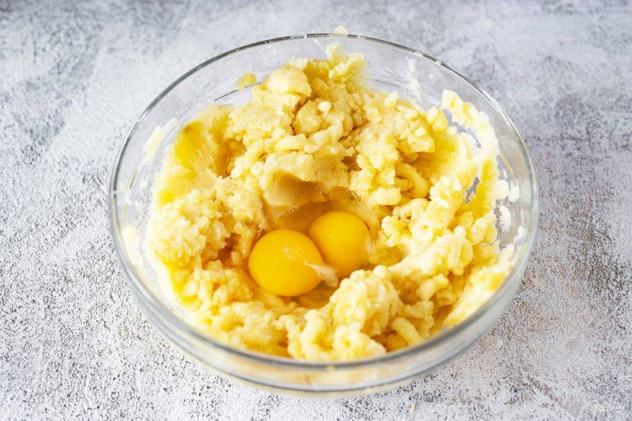 Вбейте к картофельному пюре яйца, добавьте соль. Перемешайте все вилкой.