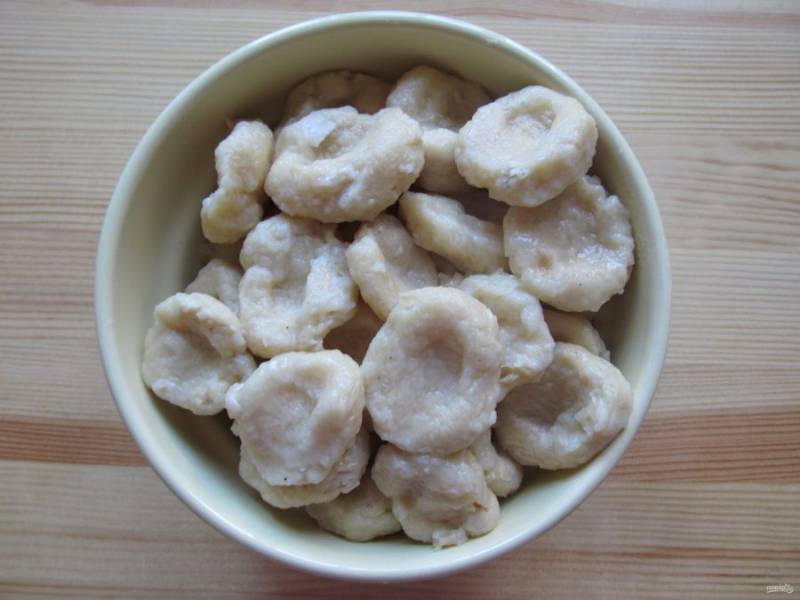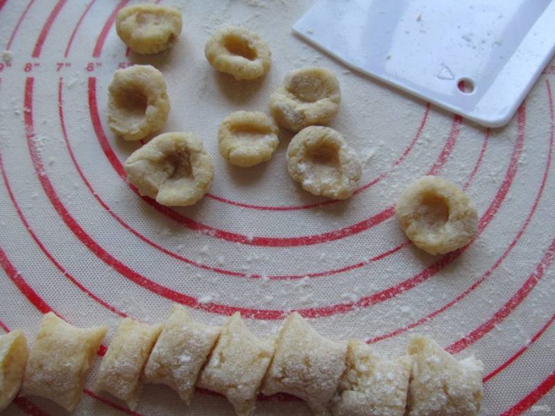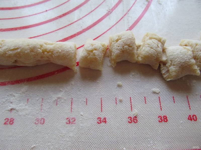Отделите кусочек теста и раскатайте колбаску, нарежьте на небольшие кусочки.