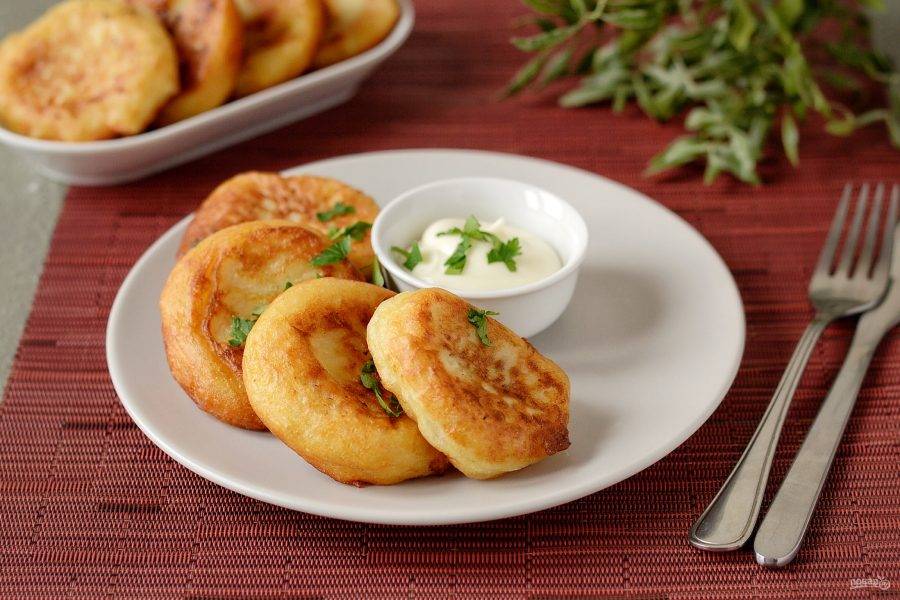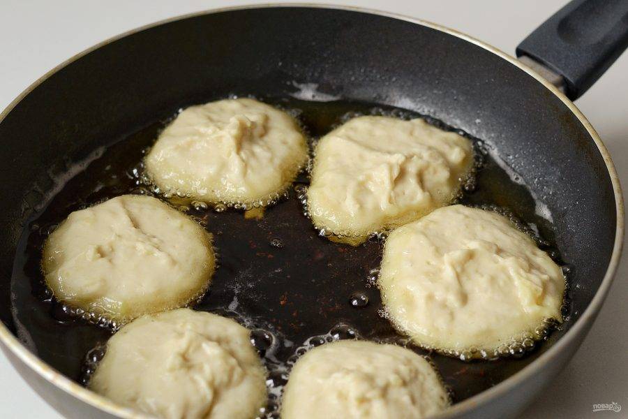 Разогрейте сковороду с большим количеством масла. Сформируйте из теста оладьи. Удобнее это делать смазанными маслом руками. Обжарьте на среднем огне до готовности.