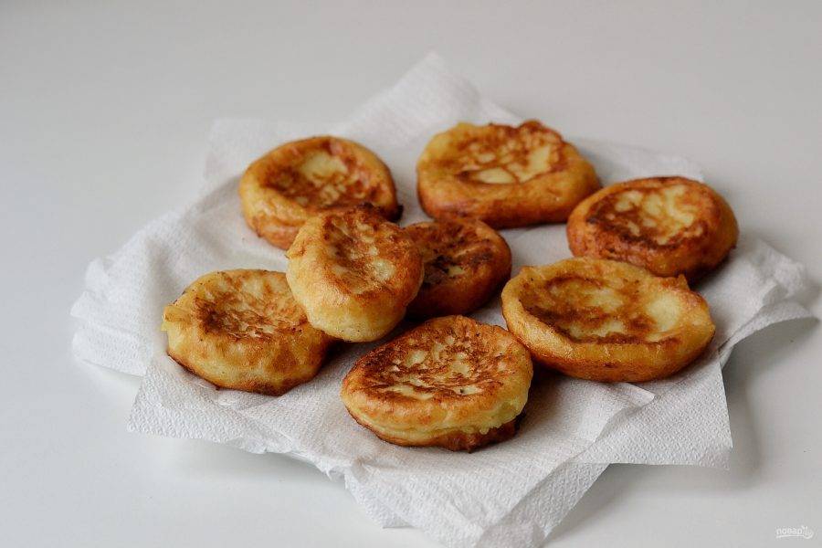 Готовые оладьи выложите на бумажные полотенца, чтобы впиталось все масло.