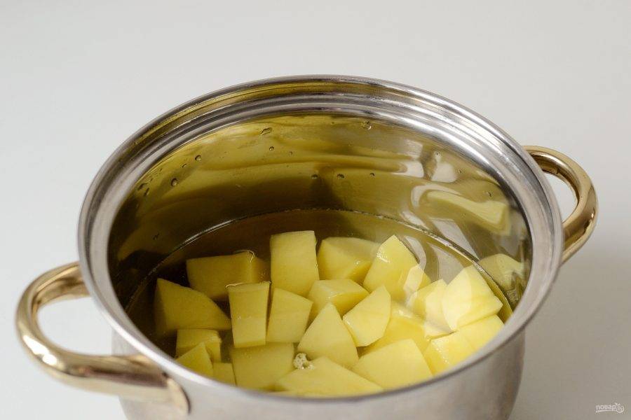 Картофель очистите, нарежьте ломтиками. Залейте водой и отварите до мягкости.