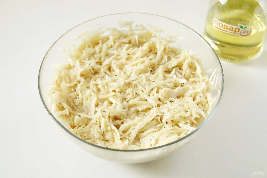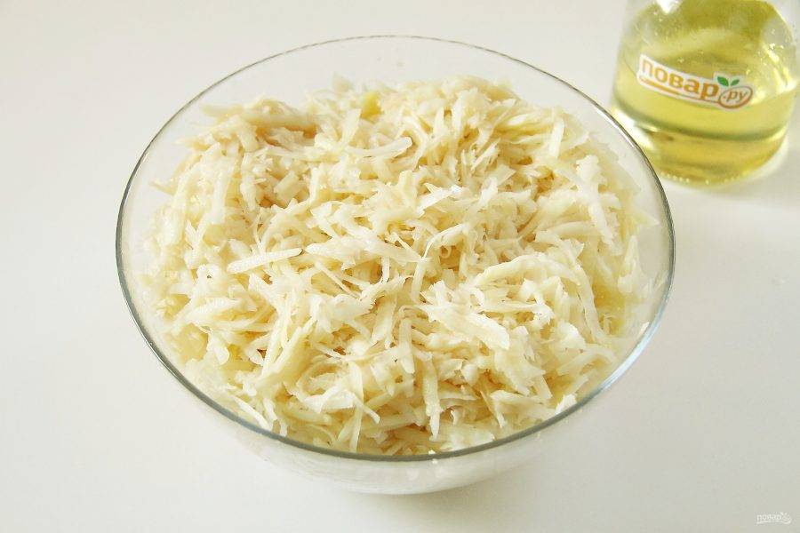 2. Картофель натрите на крупной терке, отожмите и переложите в глубокую миску.