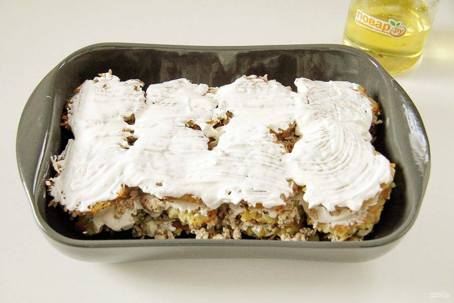 10. Затем повторите слой оладий и слой фарша. Количество слоев может быть любым, но достаточно будет ограничиться тремя слоями из оладий и двумя из фарша. Верхний слой должен быть из оладий, который необходимо так же обильно смазать сметаной. Накройте форму фольгой или крышкой и поставьте в горячую духовку, разогретую до 200 градусов, на 30 минут.