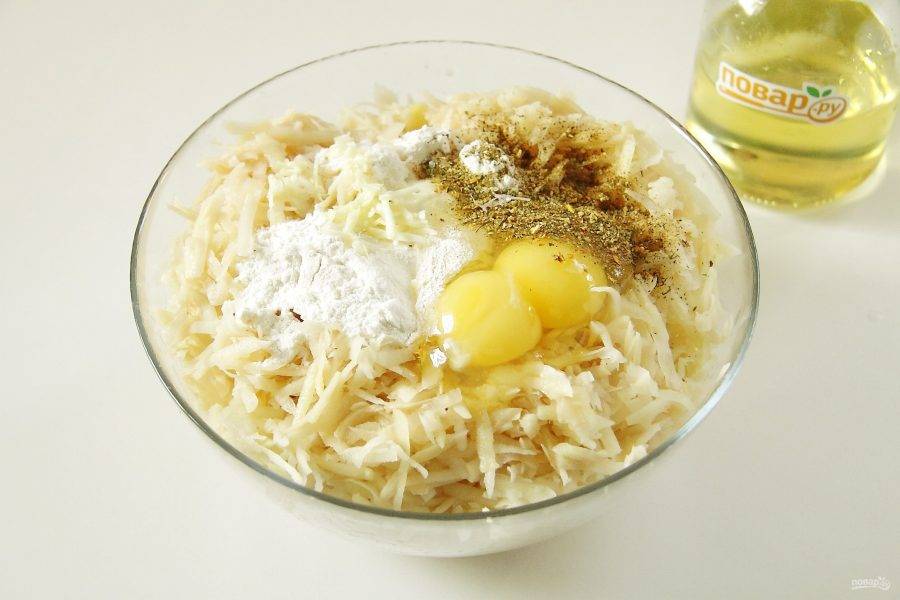 3. Добавьте к нему яйца, муку, два измельченных зубчика чеснока, соль и специи по вкусу.