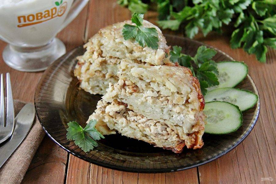 Блюдо на основе драников. В сковороде поочередно обжариваются картофельные оладьи, а затем в форме для запекания чередуются с мясным фаршем и томятся в духовке. Это не только просто, но и очень вкусно!