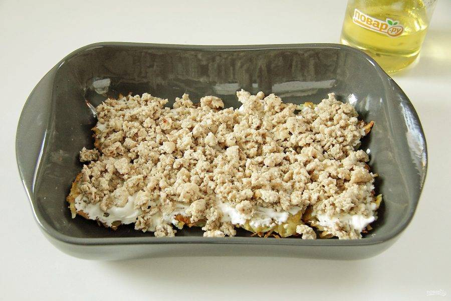 9. Сверху равномерно распределите часть обжаренного фарша.