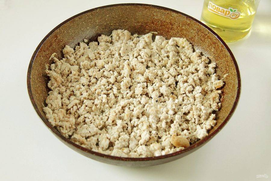 6. Затем на этой же сковороде обжарьте фарш, разбивая комочки лопаткой. Долго обжаривать не нужно, достаточно лишь, чтобы фарш побелел. Добавьте к нему в конце пропущенный через пресс чеснок, соль и специи по вкусу.