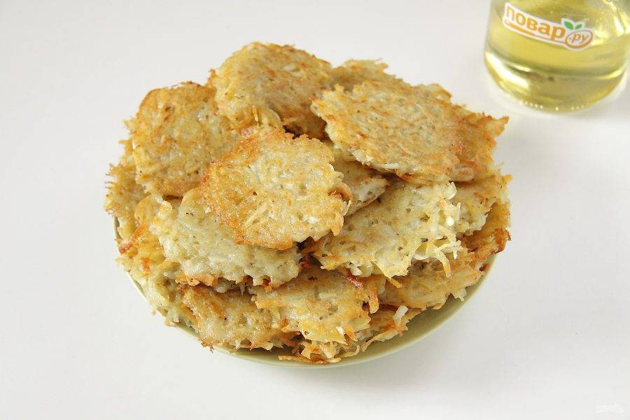 5. Разогрейте на сковороде растительное масло и, выкладывая картофельную массу столовой ложкой, обжарьте картофельные оладьи. Обжаривайте оладьи с двух сторон до появления золотистой корочки.