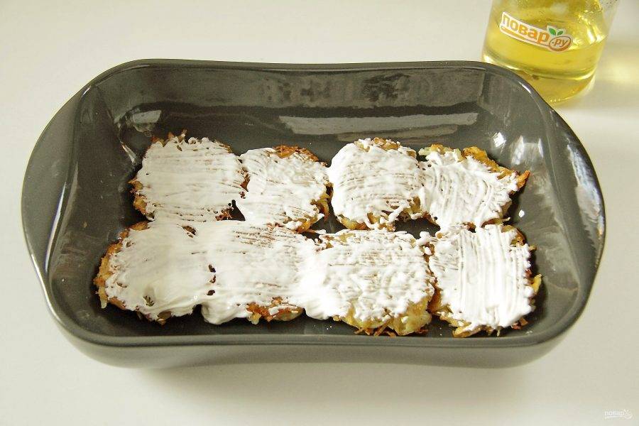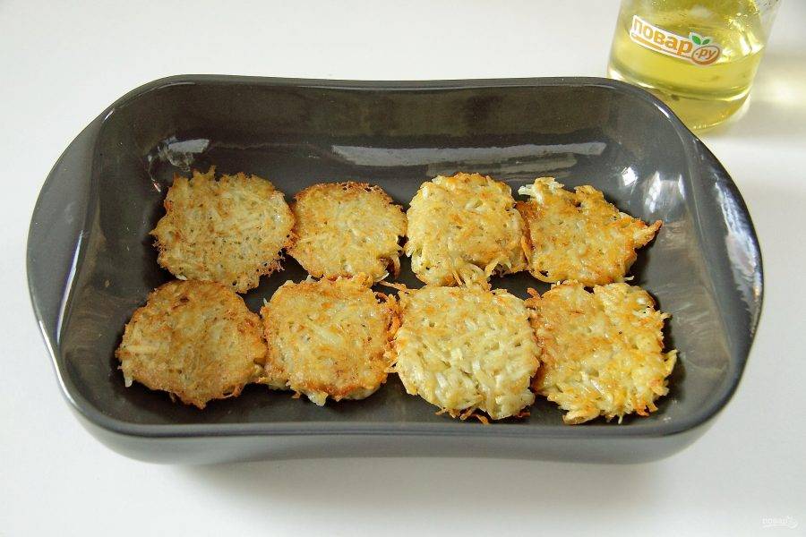 7. В форму для запекания выложите в один слой готовые картофельные оладьи.