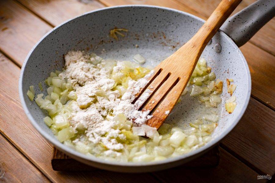 К луку добавьте 2 чайные ложки муки и, активно помешивая лопаткой, продолжайте обжаривать все вместе еще пару минут.