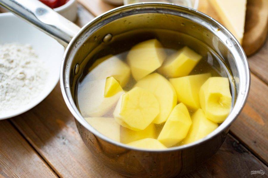 Картофель нарежьте небольшими кусочками, выложите в сотейник, залейте водой, отварите до готовности, слейте воду.