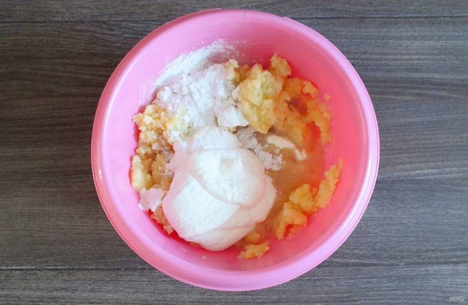 Еще теплый картофель разомните в пюре. Добавьте крахмал, взбитые яйца с солью, соду, сметану. Перемешайте.