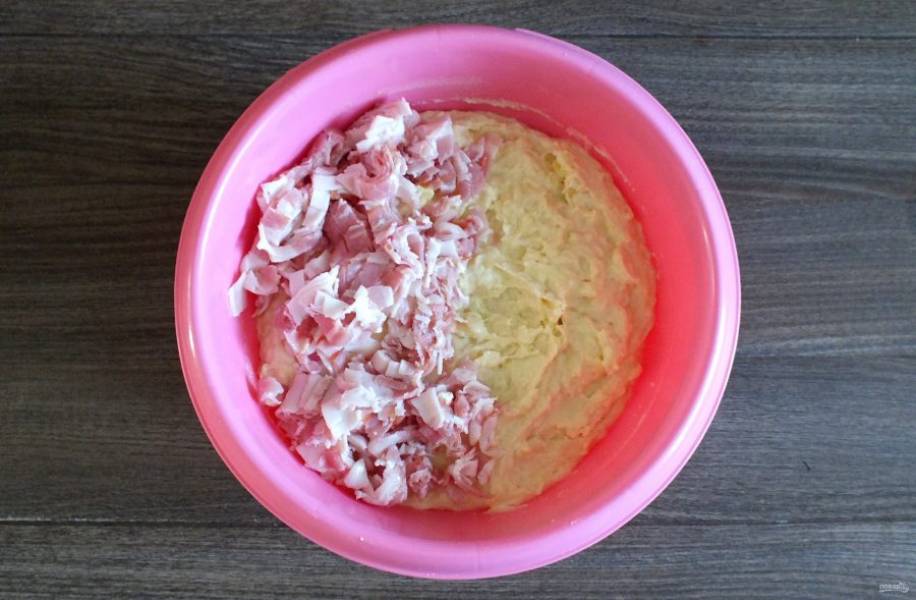 Бекон нарежьте тонкой соломкой. Добавьте в картофельное тесто. Перемешайте.
