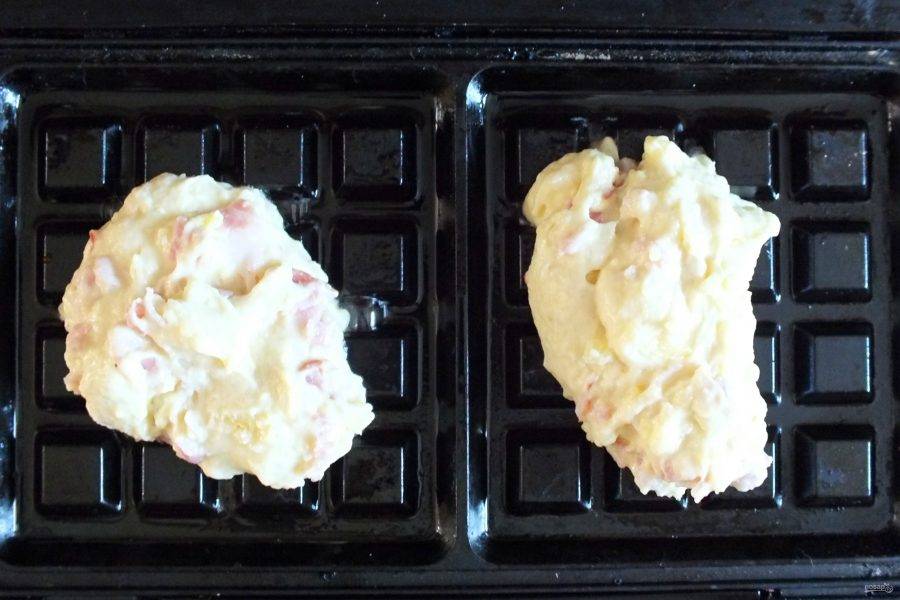 Разогрейте мультипекарь. Панели для вафель смажьте обильно растительным маслом. Выложите по 2 ст.л. теста на каждую часть. Прикройте крышкой и выпекайте в течение 5 минут.
