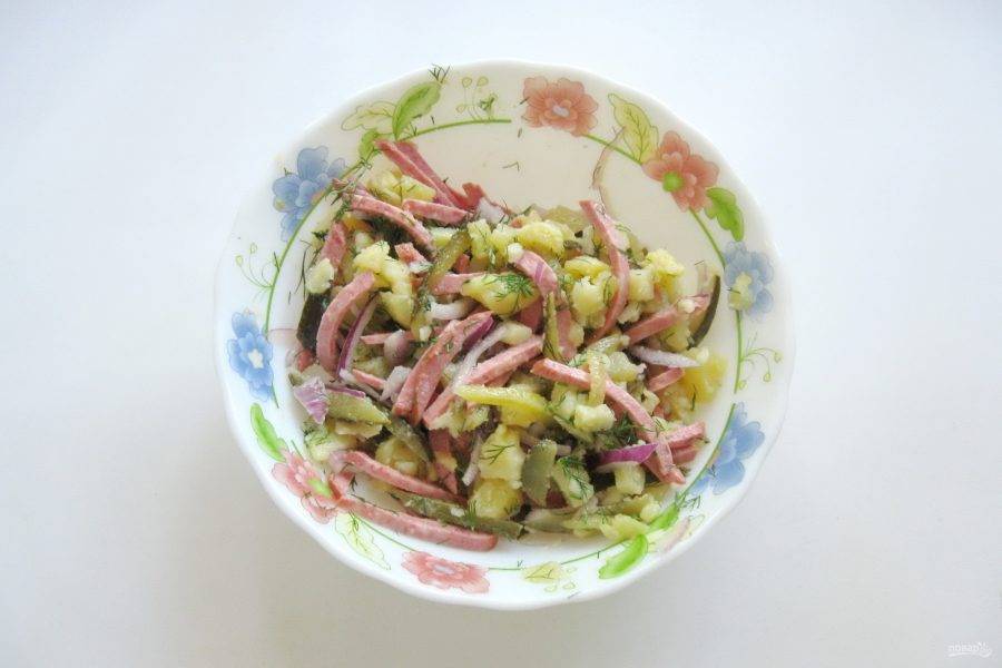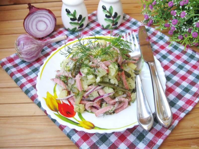 Картофельный салат с копченой колбасой - чрезвычайно сытное и вкусное блюдо. В меру острый, с хрустящим луком и маринованными огурцами салат.
