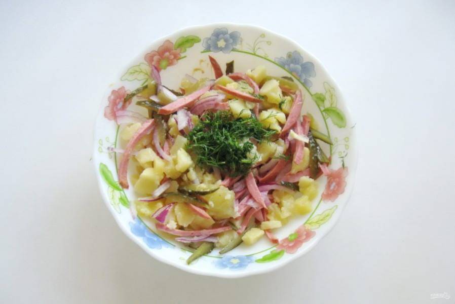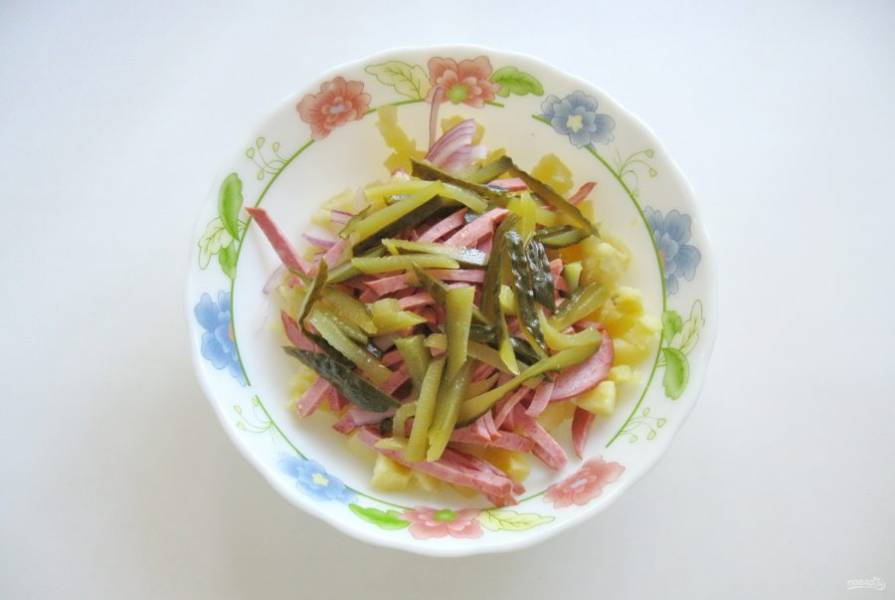 Полукопченую или копченую колбасу нарежьте соломкой. Добавьте в салат.