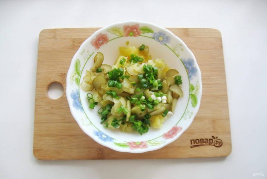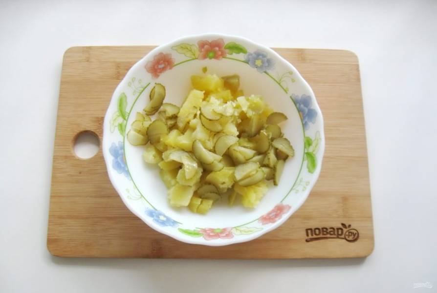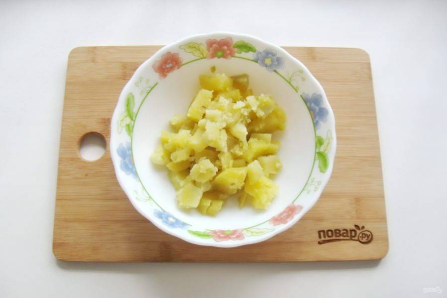 Картофель отварите, охладите и нарежьте кубиками. Выложите в салатник.