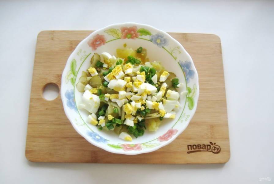Яйца сварите вкрутую, охладите, очистите и мелко нарежьте. Добавьте в салат.