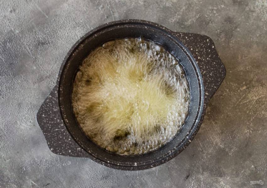 Обжарьте их во фритюре до коричневой корочки. После выложите на бумажные полотенца, чтобы впиталось лишнее масло.