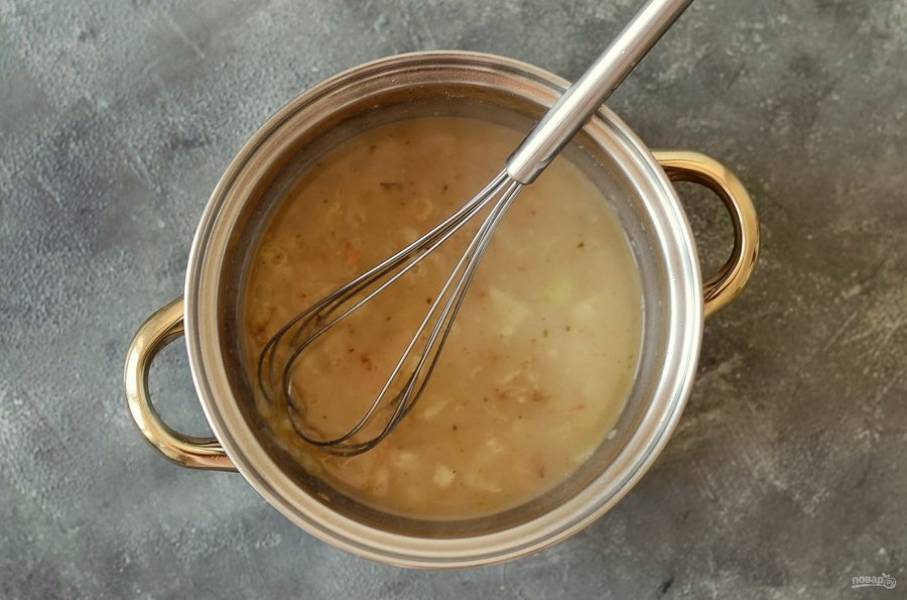 Постепенно начните вливать овощной бульон, постоянно помешивая.