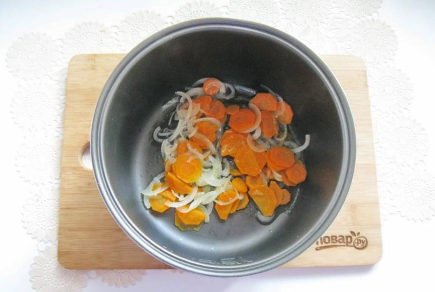 Морковь и лук очистите, помойте и нарежьте. Выложите в чашу мультиварки.