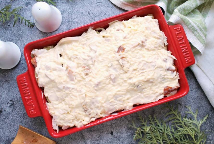 Репчатый лук мелко порежьте и обжарьте в сковороде с растительным маслом в течение 5 минут, перемешивая. Форму смажьте растительным маслом и выложите картофель ровным слоем. Сверху распределите обжаренный репчатый лук.