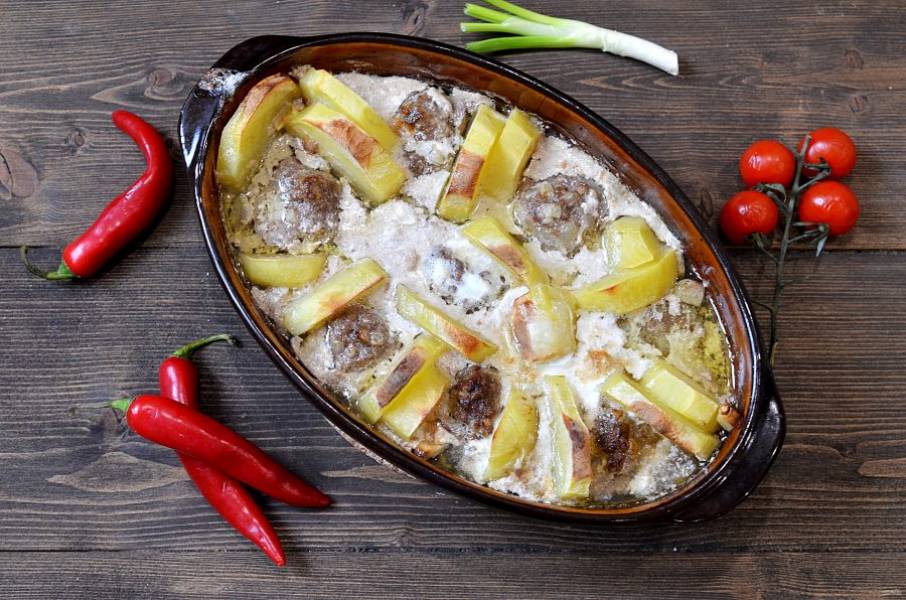 Видео рецепт "Картошка с тефтелями в сметанном соусе"