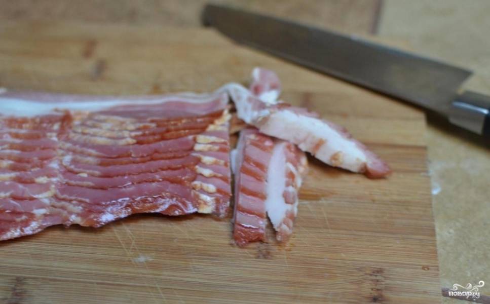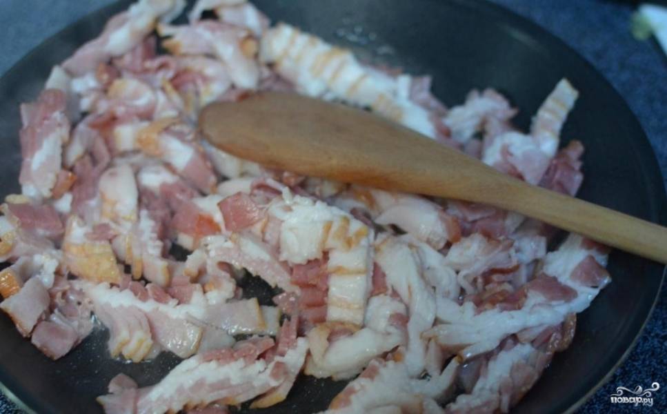 Обжариваем бекон на сковородке на небольшом огне, пока он не станет хрустящим.