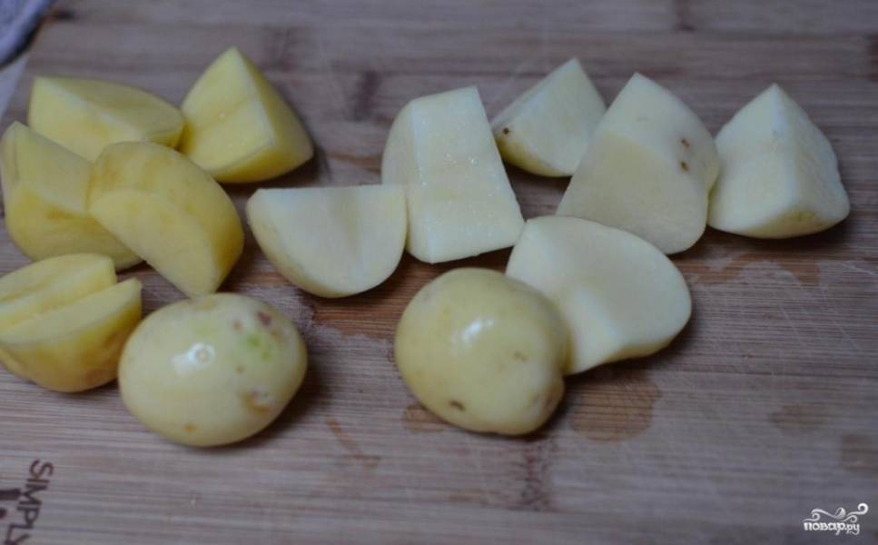 Картофель нарезаем на небольшие одинаковые части и варим в подсоленной воде до готовности.
