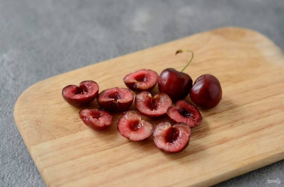 Черешню разрежьте пополам, удалите косточки.