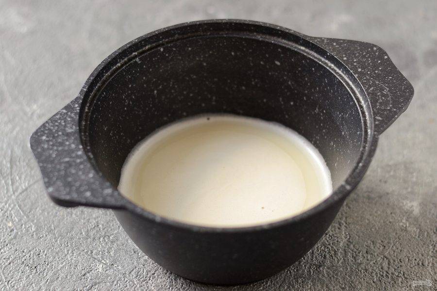 В кастрюле доведите до кипения молоко с водой. Добавьте сахар.