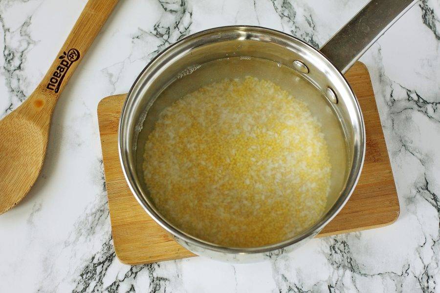 Пшено обдайте кипятком, чтобы убрать горечь и тщательно промойте. Рис так же промойте в нескольких водах до прозрачности. Промытую крупу переложите в емкость, в которой будете варить кашу.