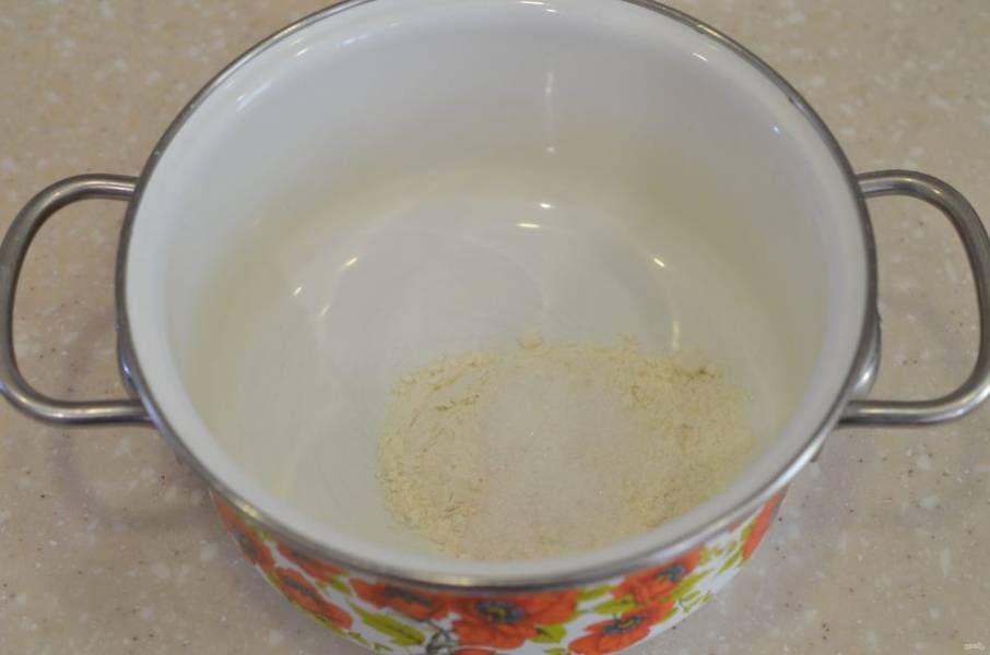 В кастрюлю всыпьте муку, соль, сахар.